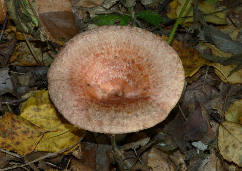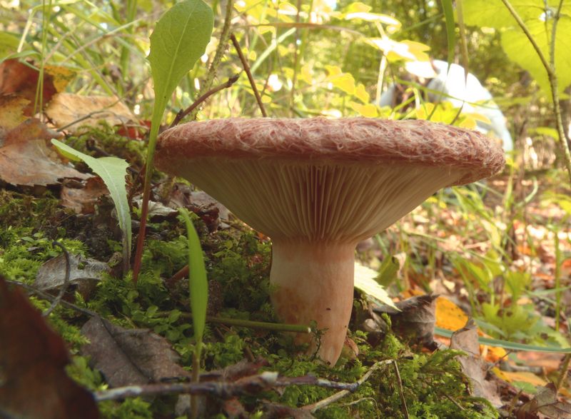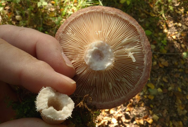 Diesen Pilz habe ich wegen seines Aussehens erst als Echten Reizker angesprochen - aber dann stelle ich fest, daß er beim Streichen über die (nicht besonders brüchigen, eher anfangs elastischen) Lamellen gar keine rote Milch hervorbringt. Auf dem Bild sind eher ein paar kleine weiße Tröpfchen zu sehen.