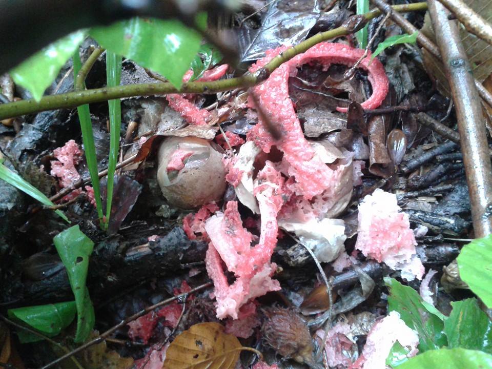 du hast ein Hexenei gefunden. Aus diesen wachsen verschiedene Pilze. Am häufigsten sind vielleicht die Stinkmorcheln. Diese zeigen beim Schnitt allerdings keine rötlich-pinken Strukturen. Du hast hier wohl das Hexenei eines Tintenfischpilzes gefunden. ![]()