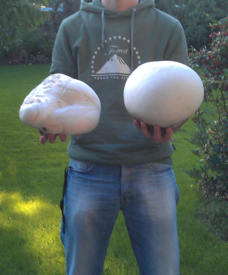 Da fahre ich doch mit meinem Kumpel den Feldweg entlang und sausen gerade an einer Rinderweide entlang, da fielen mir die beiden großen weißen Flecke ganz hinten auf. Das werden doch nicht etwa Riesenboviste sein. Für Salzlecksteine waren sie mir zu groß. Also schnell über den Zaun gehüpft und elegant den neugierigen Rindern ausgewichen (man kennt sich ja:-)). Da lagen sie doch tatsächlich vor mir. Der eine Rund wie ein Fußball und derandere etwas knubbelig. Beide wunderschön wie ich finde. Sie durften mir auf der Rückfahrt gesellschaft leißten und endeten als Schnitzel.