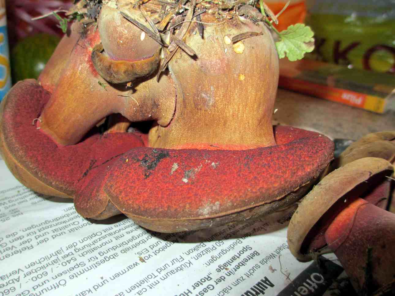 • Die Pilze waren nur während dem Putzen in der Schüssel. Ich habe gerade akuten Platzmangel in der Küche, da auf dem großen Tisch noch ca. 100 Tomaten darauf warten eingekocht zu werden. Nach dem Putzen kamen sie auf die Zeitung, wurden geschnippelt und zum großen Teil eingefroren.