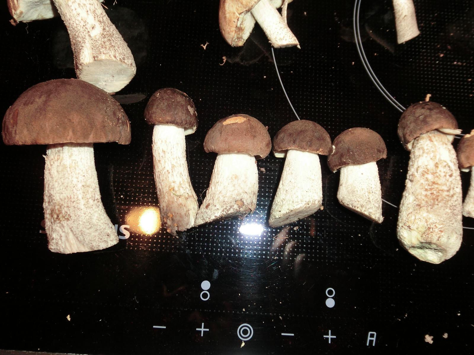 Das sind die aus dem Farnfeld, ca. 5-8cm groß, recht dunkle Kappe, weiße röhren