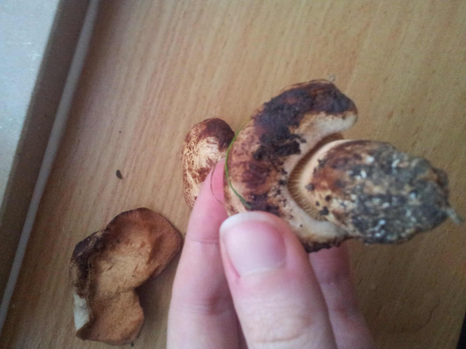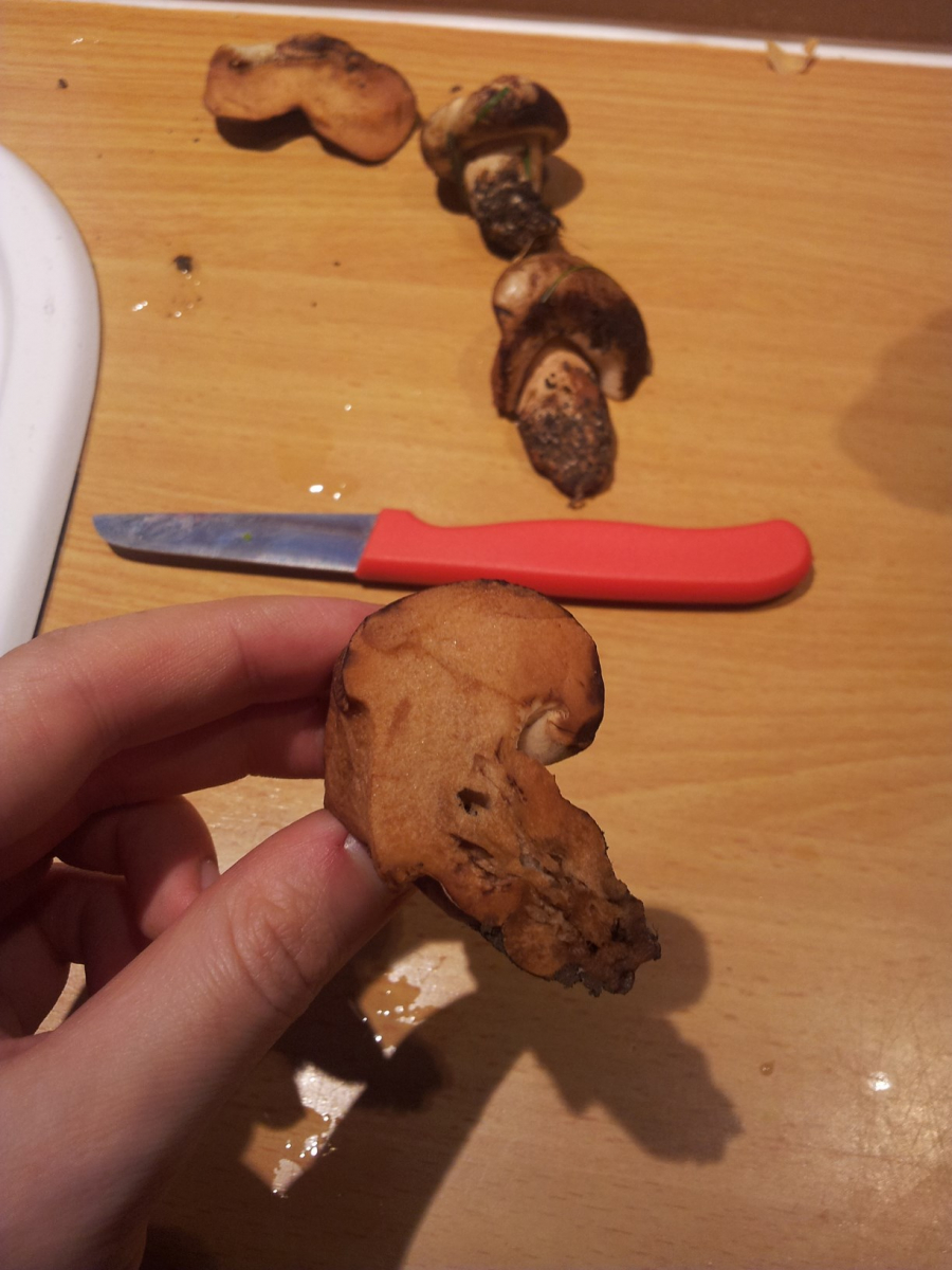 eine Freundin hat mir grad Fotos von einem Pilz aus ihrem Garten geschickt. Ihre Beschreibung dazu: "Sind rechts von der Terasse im Gras gewachsen, ist ziemlich fest, riecht sehr... frisch? Metallig irgendwie? Schnitt verfärbt sich ins gold-rötliche, relbe, geriffelte Lamellen. Hat von der Optik was von Marmorkuchen ^^"