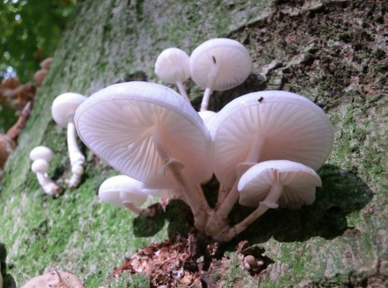 Das sind Buchenschleimrüblinge (Oudemansiella mucida).