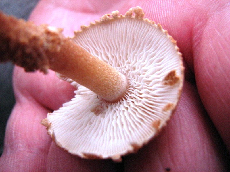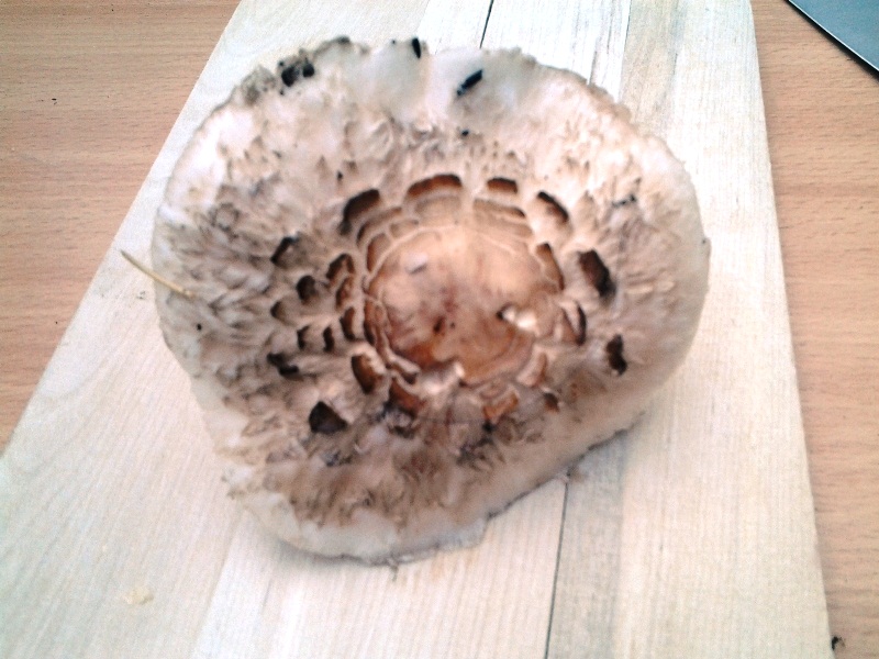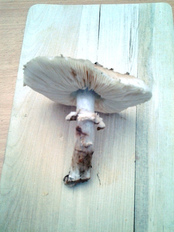 Hut hat etwa 5-10 cm Durchmesser und einen frei beweglichen Ring am glatten Stiel. Weißes Sporenpulver (hab' versehentlich auf einen draufgetreten, der ist förmlich explodiert...)