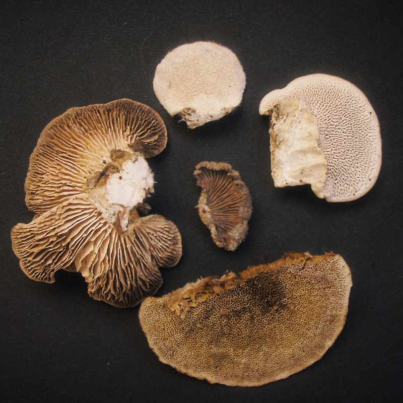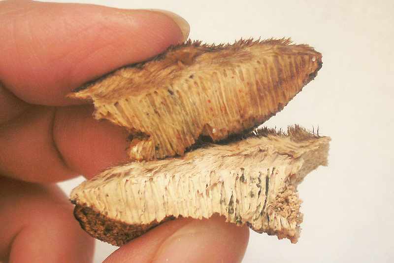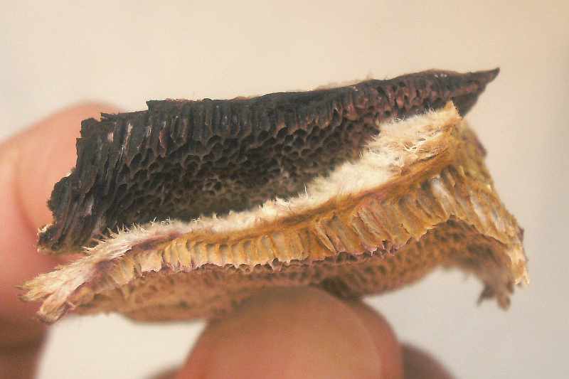 Trama und Röhren im feuchten Zustand zäh zerreißbar und holzig-gelblich orange, im trockenen Zustand hart und creme-weißlich