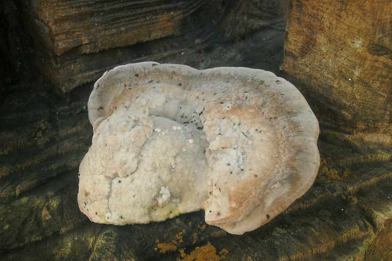 An einem Totholzstamm (aufrecht), der zu einem Kunstwerk bearbeitet worden war, sah ich im unteren Bereich mehrere große Porenpilze.