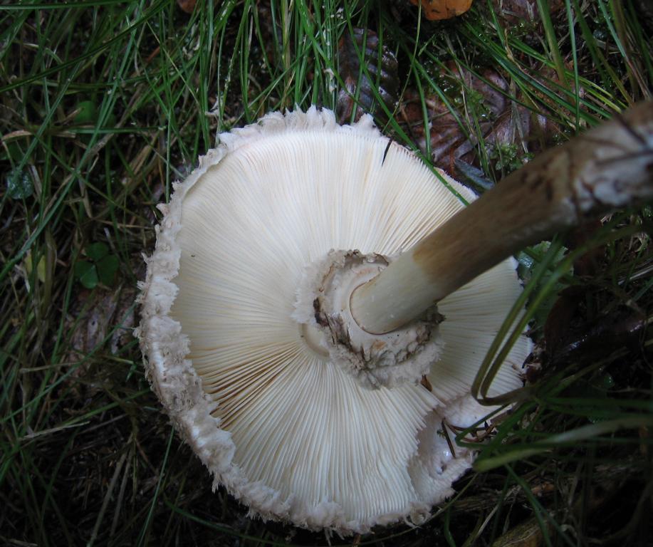Lamellen: cremeweiss, ziemlich engstehend mit Zwischenlamellen und durch den Ringwulst frei vom Stiel. Beim Ärgern, etwa auf Druck oder Verletzung rötlich färbend.