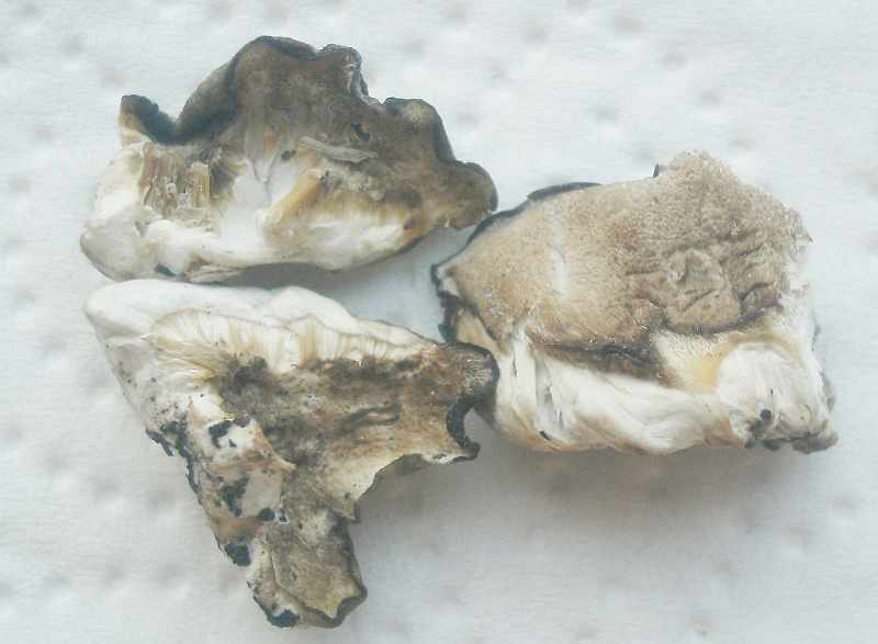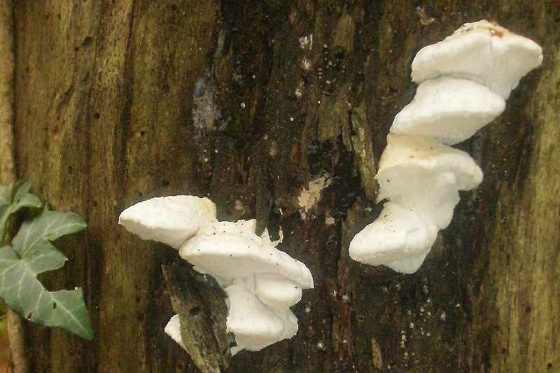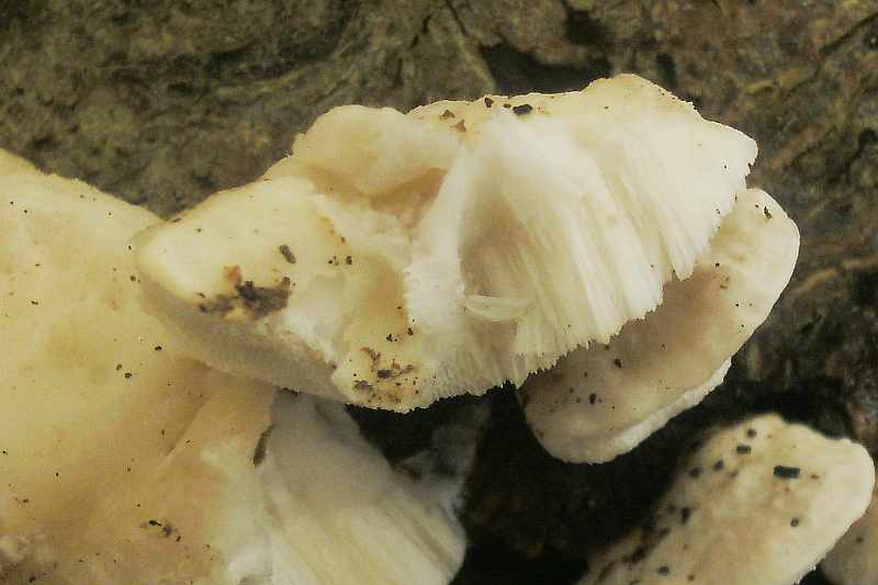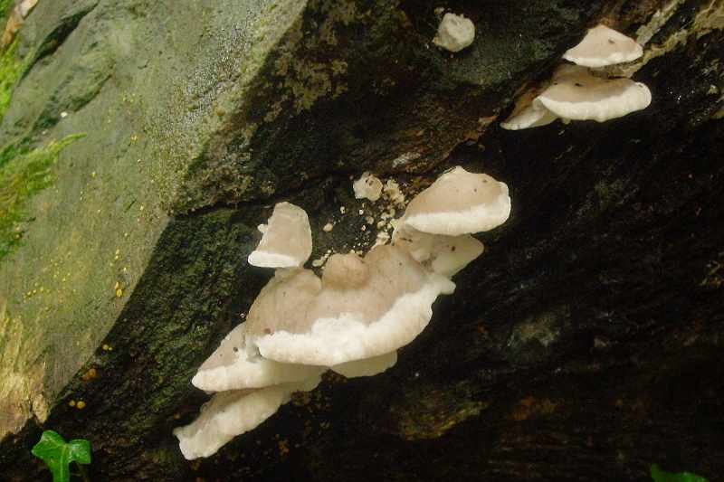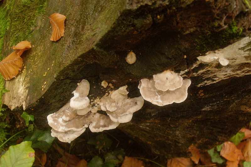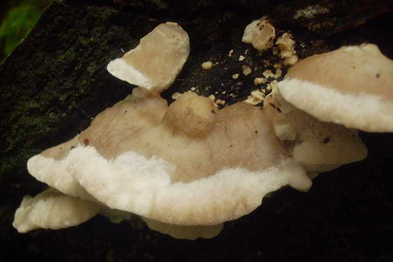 mehrere teils einzelne teils geschichtete dicke Hüte (größere Exemplare bis ca. 6 cm breit und 4 cm abstehend, 2-3 cm dick angewachsen)