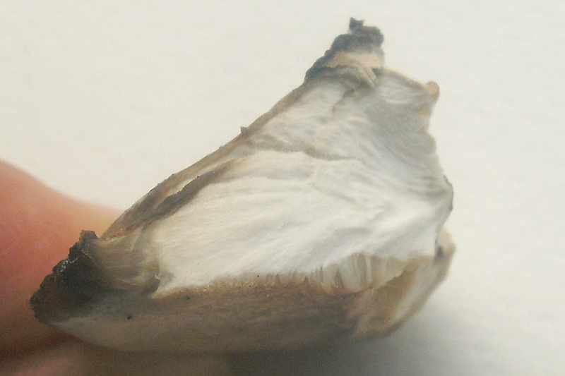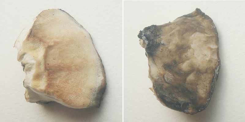 Oberfläche weich samtartig (ohne deutlich erkennbare Haare), hell-beige-grau, Zuwachskante weiß, dunkelt beim Lagern nach