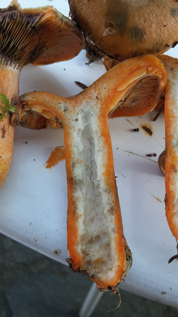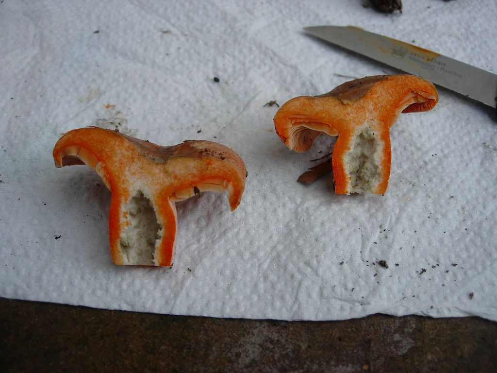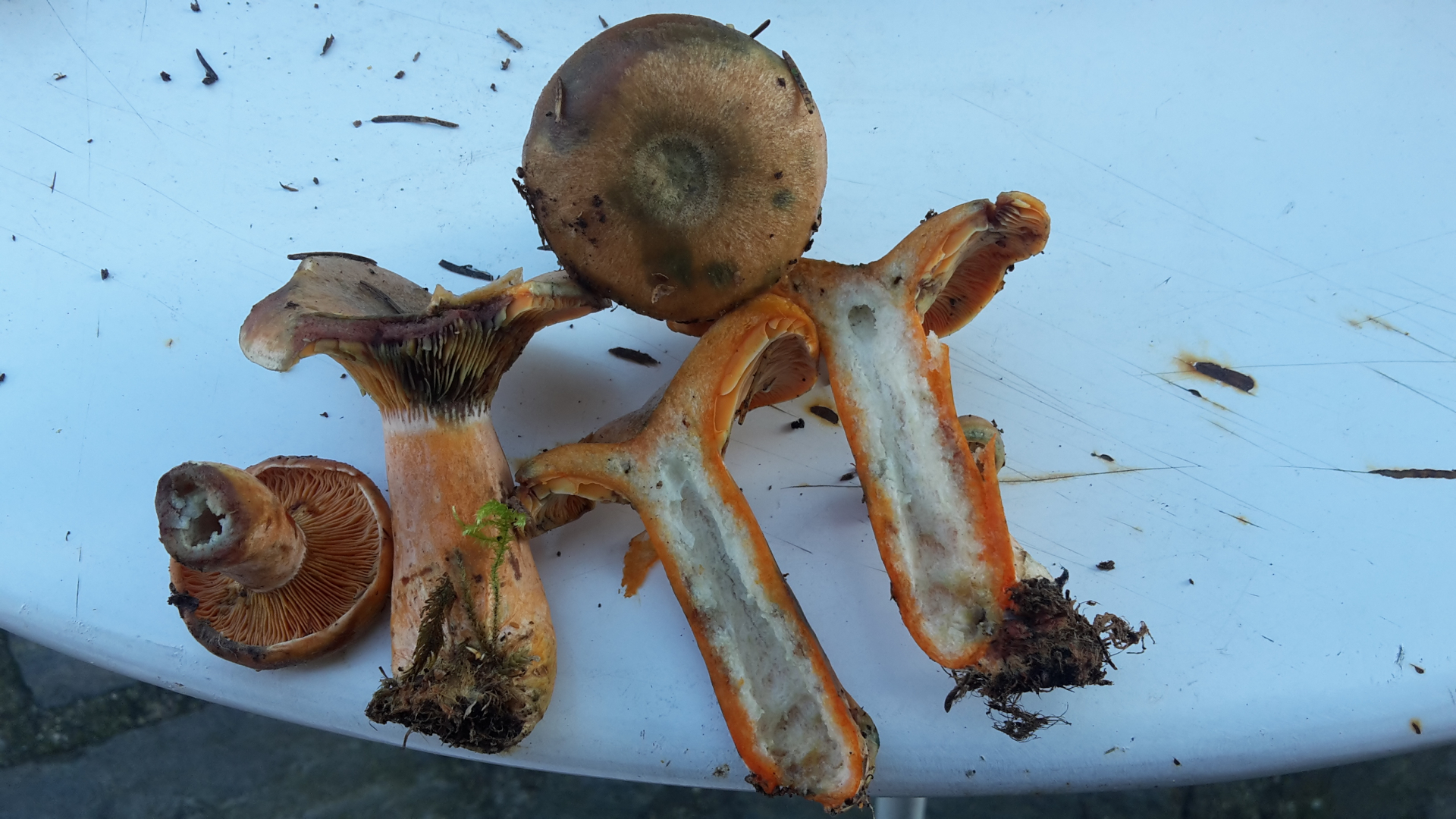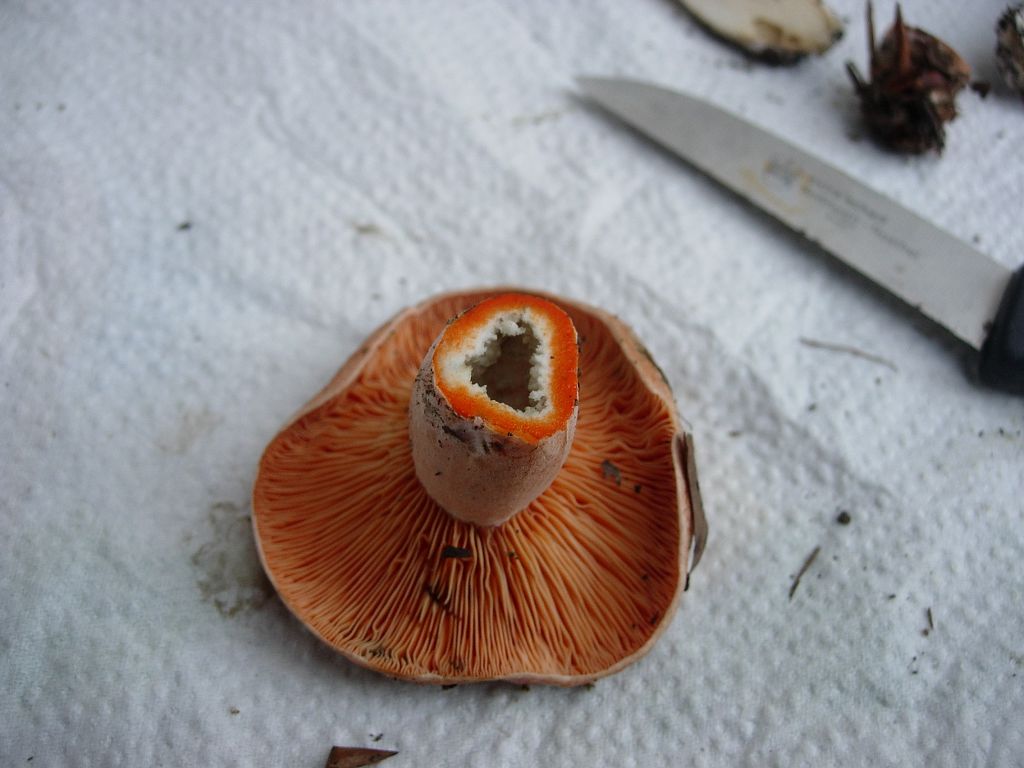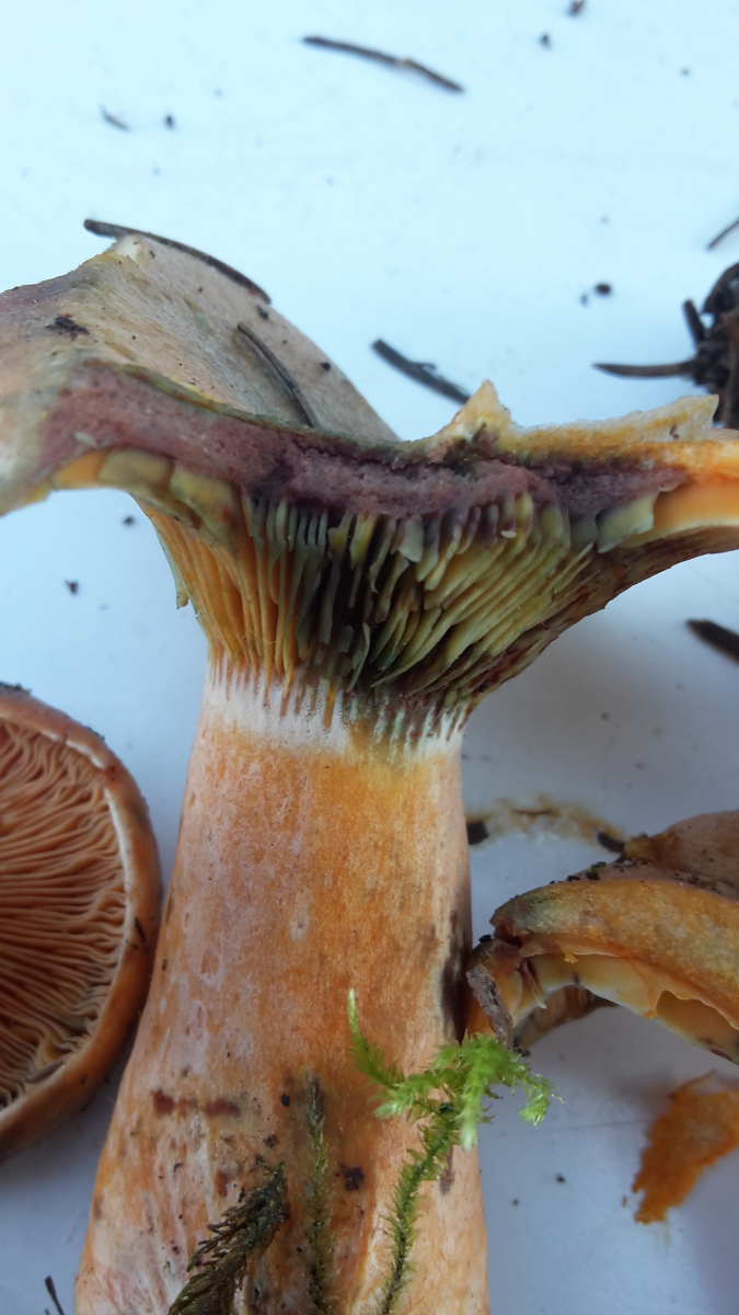 Orange Milch erst nach einiger Zeit (15-30 Min.) Rot, Fleisch un Milch nach einige Stunden Grün, keine grübchen am Stiel. Bei Fichte.