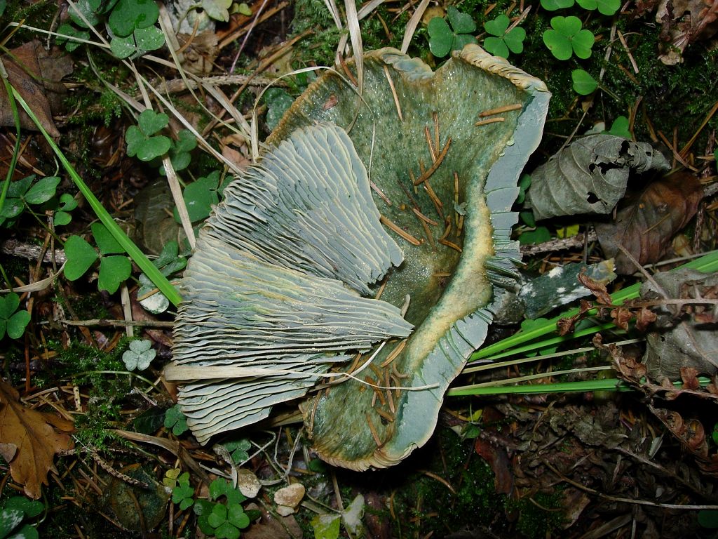 Lamellen: dicht stehend, bogig und am Stiel angewachsen manchmal laufen ein wenig daran herab. Sie sind brüchig und sowohl mit kürzeren Zwischenlamellen untermischt als auch in Stielnähe teilweise gegabelt. Im Alter oder bei Verletzung bekommen sie zunächst dunkelrote, dann graugrüne Flecken.
