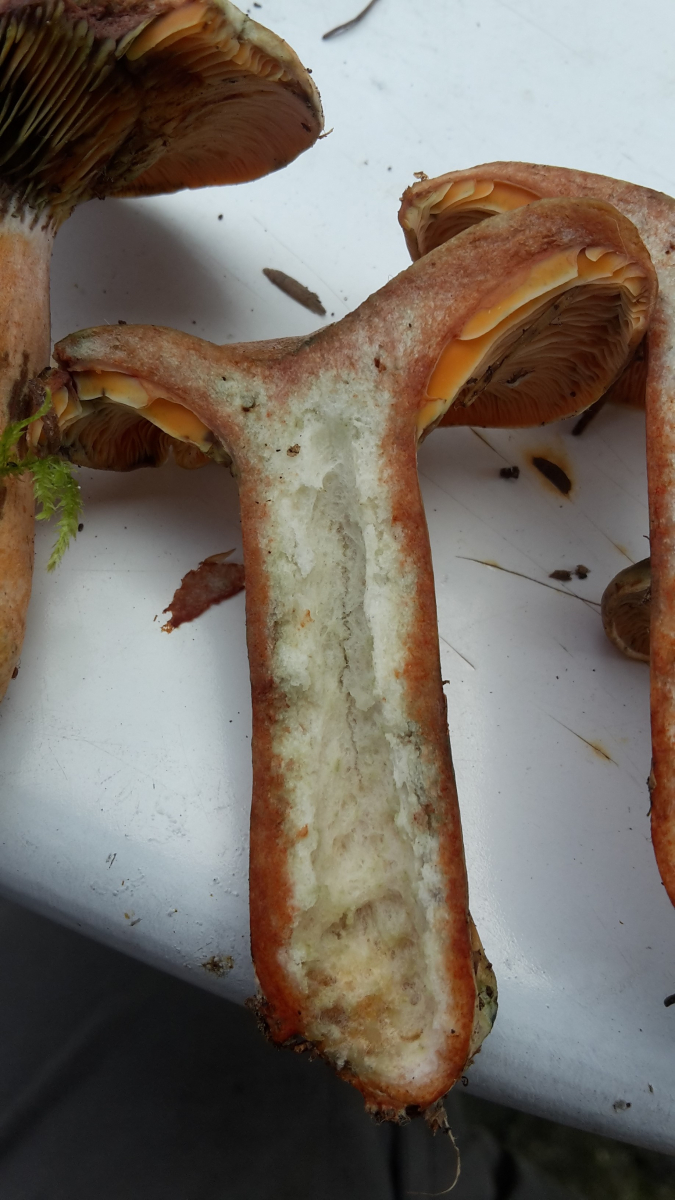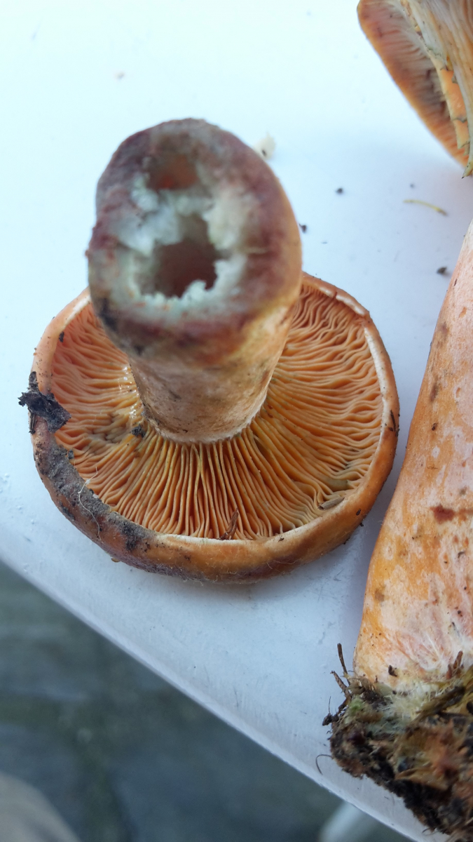 Orange Milch erst nach einiger Zeit (15-30 Min.) Rot, Fleisch un Milch nach einige Stunden Grün, keine grübchen am Stiel. Bei Fichte.