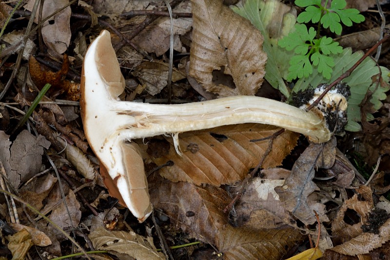 Großer Rettichfälbling (Hebeloma sinapizans). Dieser weiße Zapfen, der vom Hut in die Stielmitte reinreicht, soll ein typisches Merkmal sein.