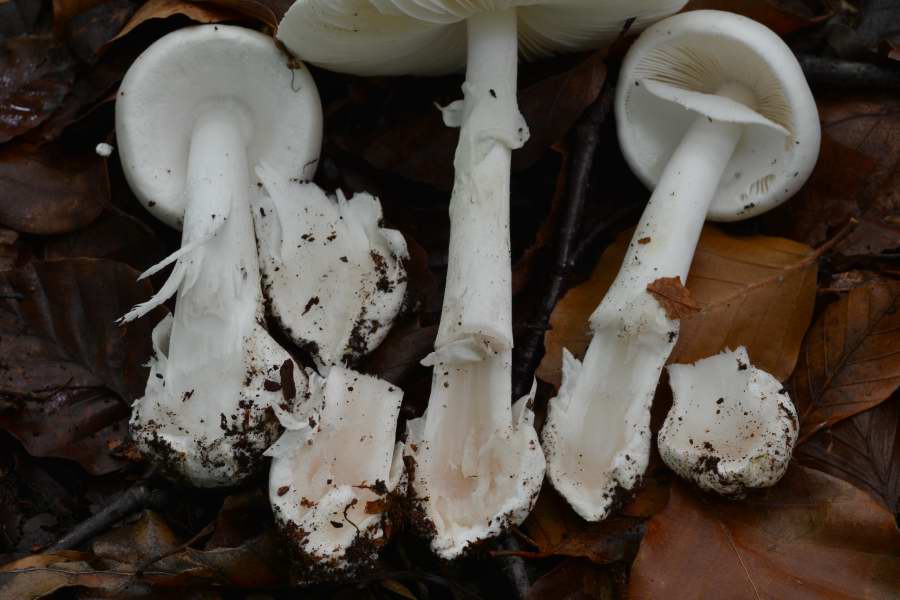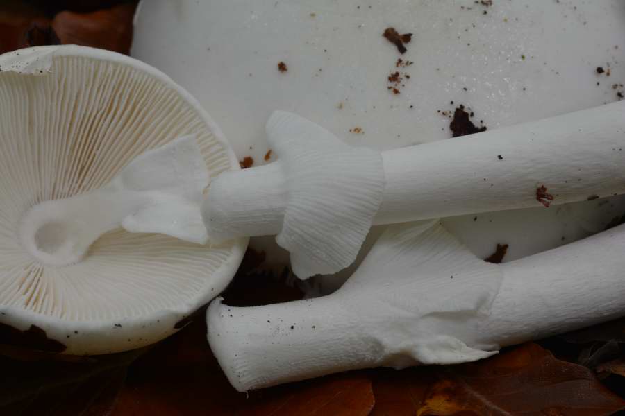 ich denke hier an die weiße Form des Grünen Knollenblätterpilzes, Amanita phalloides var. alba. Den kegelhütigen, A. virosa, sowie die weiße Form des gelben Knollenblätterpilzes, Amanita citrina var. alba, würde ich für meine Begriffe hier eher ausschließen wollen.