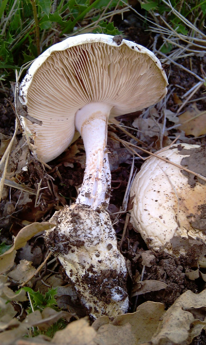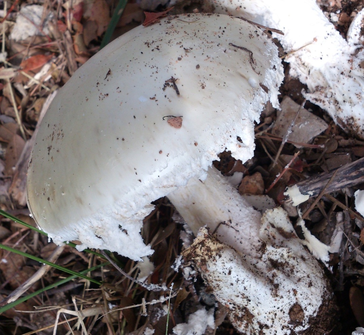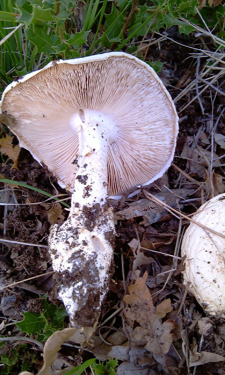 Dann habe ich den Kleinen (Hühnereigröße) gefunden und wegen der Hülle/Schleier auch mal über Cortinarien nachgedacht, aber nichts gefunden, was derart weiß auf Ober- und Unterseite ist. Erst die ganz alten Exemplare zeigen leichte cremefarben der Lamellen.