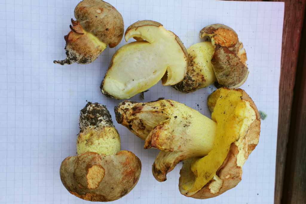 Hut ca. 5cm im Durchmesser, creme-weiß bis hellbraun, matt filzig, sehr ähnlich der Ziegenlippe. Röhren erinnerten mich auch in ihrer Farbe an die Ziegenlippe, waren leuchtend gelb, aber Poren weitaus feiner als bei dieser. Stiel schlank, ca. 7cm, ganz leicht rauh, im oberen Ende leicht rötlich gekörnt, faserig-fest (typisch Röhrling, wie Marone oder Ziegenlippe), Stielbasis nicht verdickt oder sonstwie aufällig.