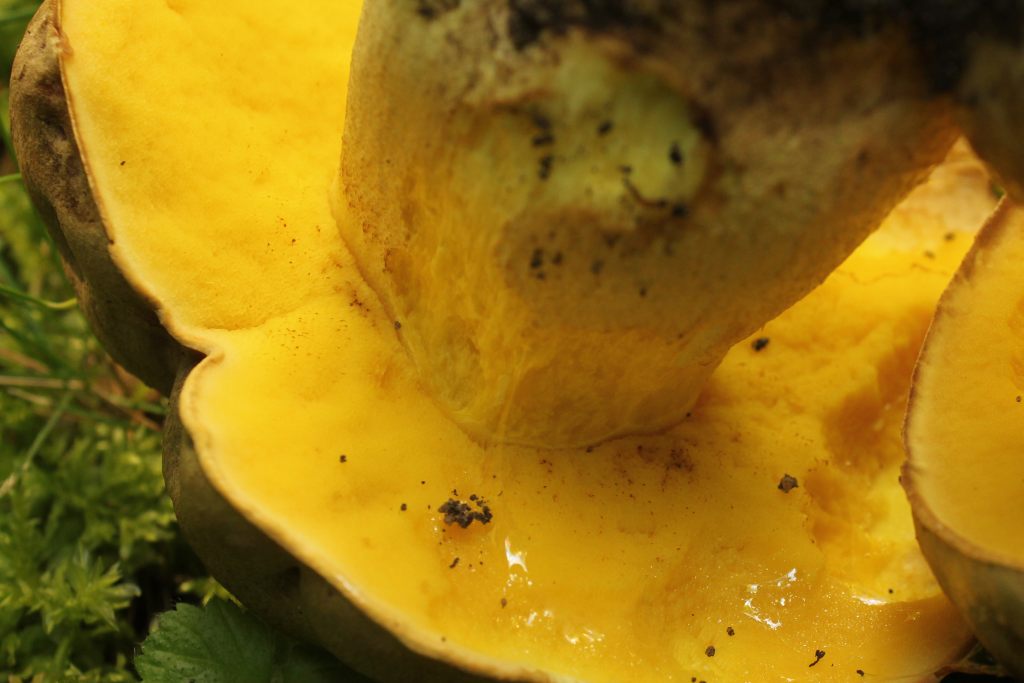 Auf Druck keine Verfärbung der Röhren, Stiel oder Hut. Bei Anschnitt nach kurzer Zeit eine ganz leichte Gelbfärbung oberhalb und seitlich der Röhren, unterhalb des Hutes leicht rosa getönt (scheint aber keine Verfärbung aufgrund Sauerstoffkontakt zu sein sondern normale Farbe des Fruchtfleisches). Gelbliche Verfärbung in der Stielbasis, die für Boletus impolitus typisch sein soll, habe ich nicht feststellen können.