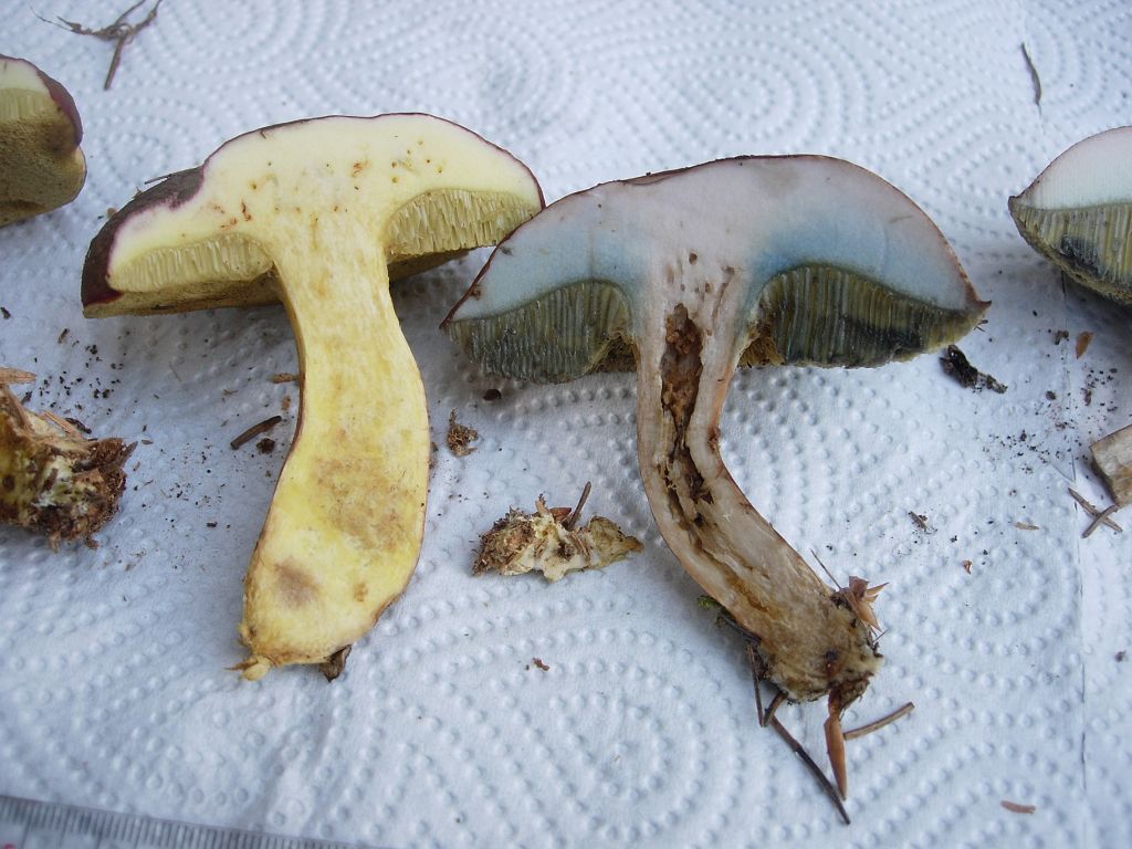 Auf Bild 2 (Schnittbild) sieht man unten am Stiel - von dem ungeschickterweise die wichtige untere Hälfte fehlt - aber eine Blaufärbung. Zusammen mit dem weißlichen Fleisch (überbelichtet?) und dem schlanken Habitus betrachtet wäre hier auch X. cisalpinus möglich.