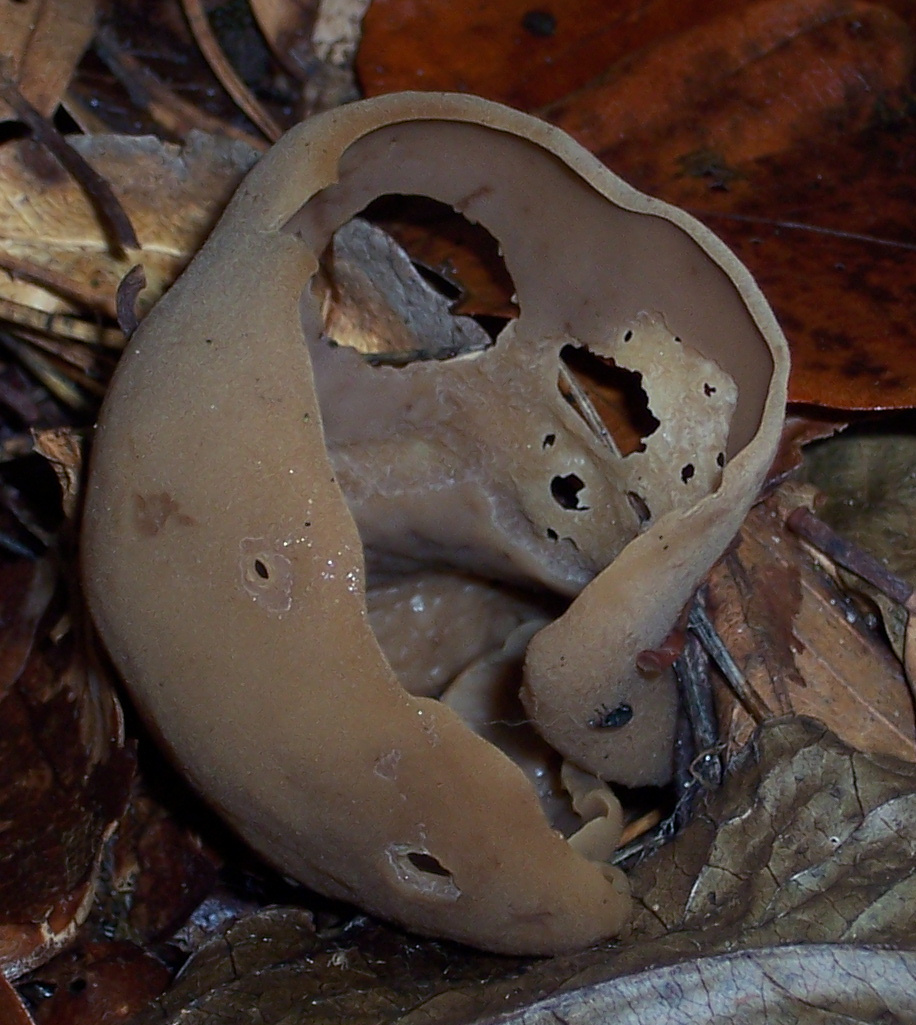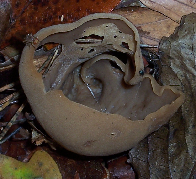 Ich war davon ausgegangen, dass es sich bei dem relativ großen Becherling um einen Öhrling handelt, da er an einer Seite geöffnet ist. Die Gattung Peziza kommt also nicht in Frage. Leider kenne ich keinen Gattungsschlüssel, so dass ich nicht ausschließen kann, dass es andere Gattungen mit der gleichen Eigenschaft gibt.