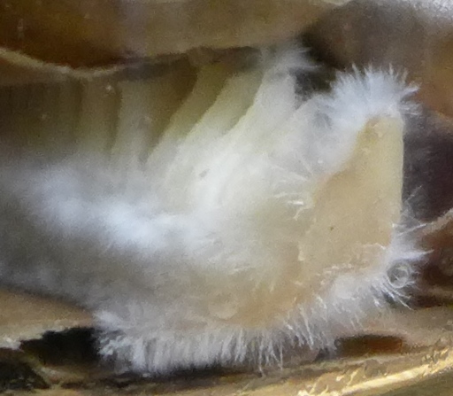 An einigen Stellen kann man ebenso erkennen, dass das Myzel Kontakt zum Substrat "Pappe" aufgenommen hat und beim "kosten" ist...