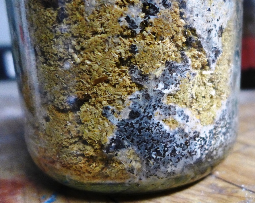 Nun habe ich auch den zweiten Eimer noch mal hervorgekramt, in dem ich ja ganz klar ollen Brot- oder Schwarzschimmel hatte. Der hat auch ein interessantes Bild: auch hier hat die Auster gut 80% des gesamten Substrats für sich eingenommen. Nur zwei streicholzschachtelgroße Flecken sind mit dem Keim bewachsen, aber eingeengt und abgestorben an den Rändern, wo die Auster scheinbar stärker war...