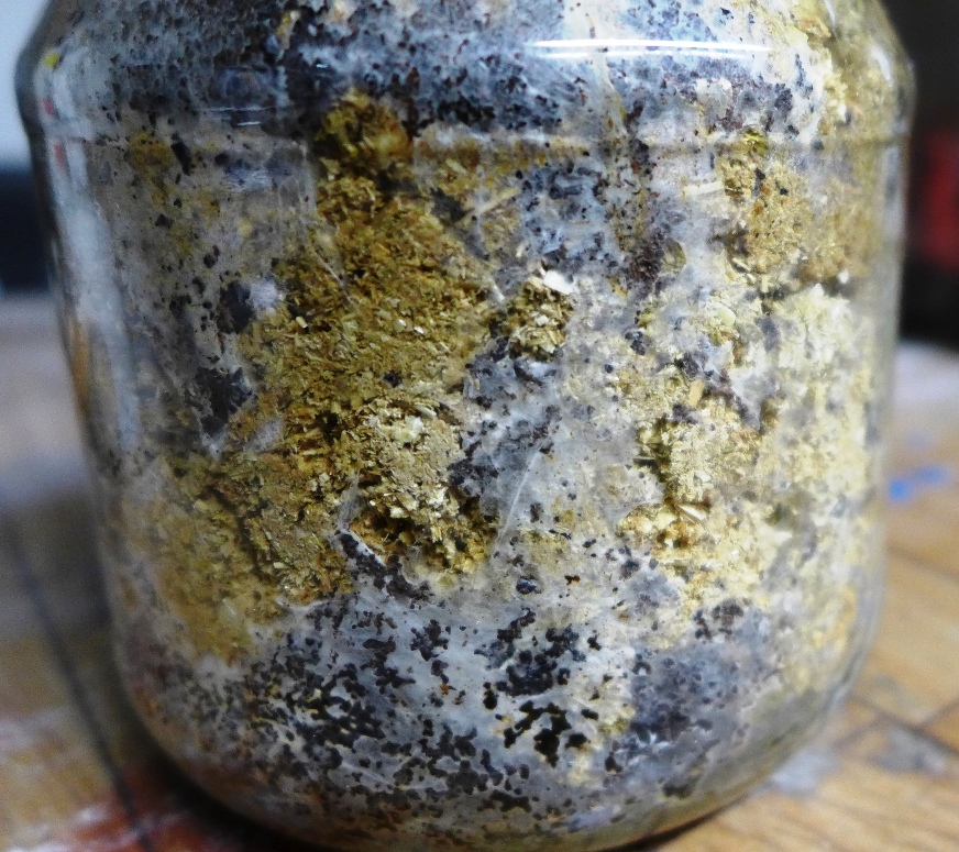 Das dritte Glas mit 100% Kaffeesatz habe ich, weil ich dachte 100% Kaffeesatz ist schlecht, mit abgekochter pappe durchmischt. Hier wächst noch Myzel, aber auch dieses Glas ist einfach zu feucht.