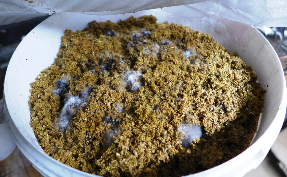 Neues Scale 2 ist 20% durchwachsener Kaffeesatz und 80% Strohpellets. Es sieht so aus, als wenn der Pilz vom Kaffeesatz auf das Stroh überwächst.