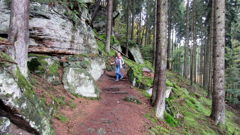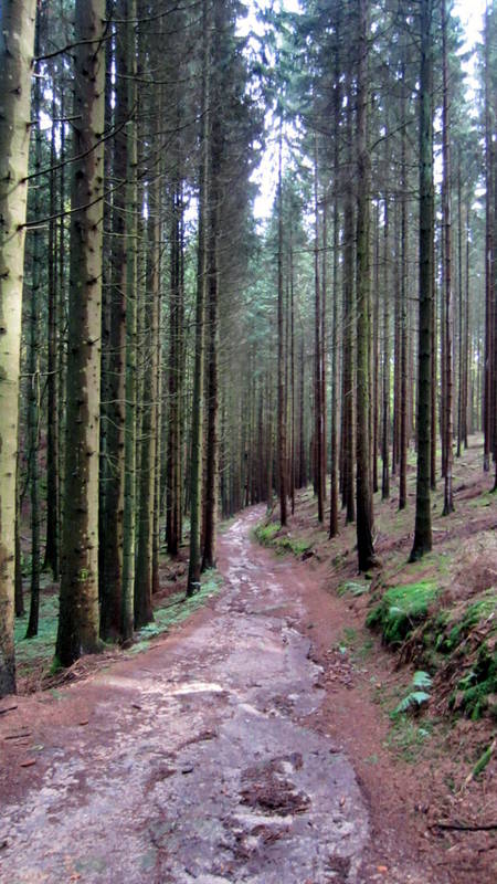 Nach ca. 500 Meter machte der Wanderweg einen 90 Grad Knick und ging leicht Berg hinab in den Fichtenwald. Hier fing der eigentliche Mullerthal Trail.