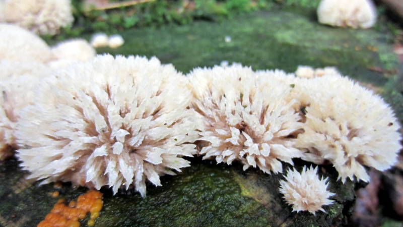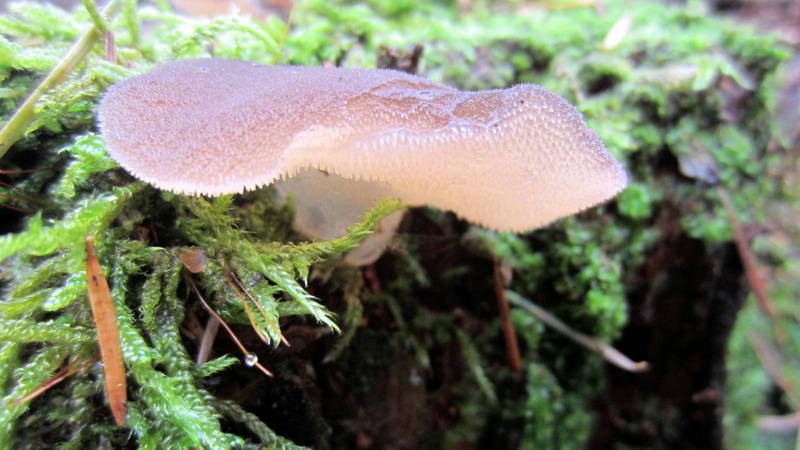 Auf einem vermoosten Baustamm (vermutlich Fichte) fand ich dann diesen gelatinösen Pilz, müsste Zitterzahn (Pseudohydnum gelatinosum) sein.