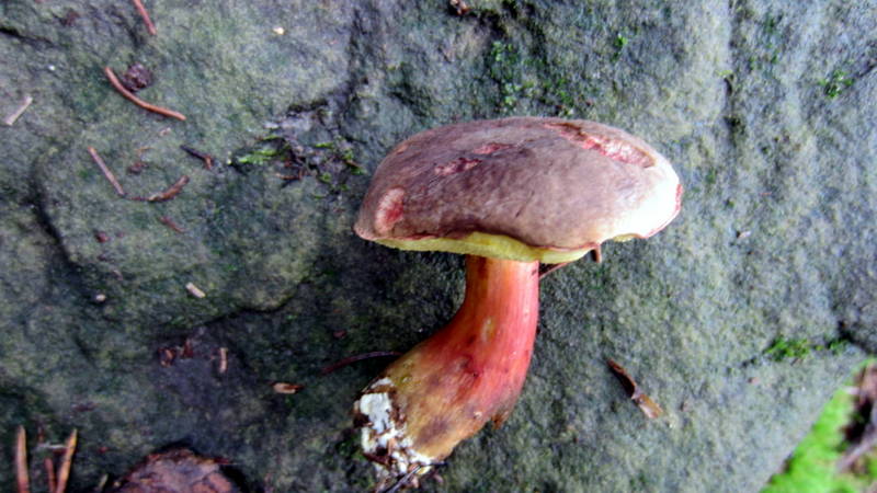 Hier müsste der Bereifte Rotfußröhrling (Xerocomellus pruinatus, syn. Boletus pruinatus, Xerocomus pruinatus):