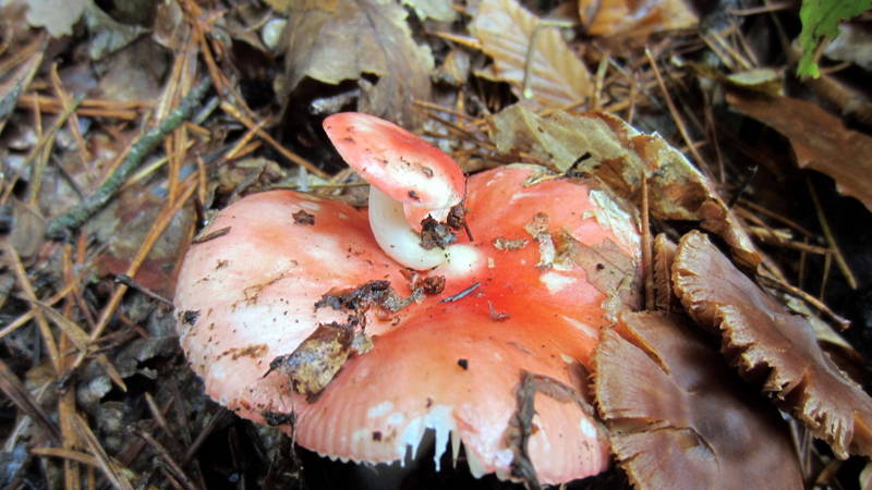 Zwei Täublinge-Akrobaten, vermutlich handelt sich hier um ein Speitäubling, z.B. Kiefern-Speitäubling (Russula emetica).