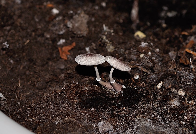 In den vergangenen Tagen habe ich an meinem Arbeitsplatz im Blumentopf, ein paar Faltenschirmlinge gefunden, die ich als Lilakörnige Faltenschirmlinge ansprechen würde. Die frischen Fruchtkörper hatte ein geriefte, weißliche Kappe mit bräunlichen-lilafarbigen Flöckchen die später bei getrockneten Exemplaren noch intensiver zu erkennen waren. Stiel war oberhalb des trichterförmigen, unterseits lilafarbigen Rings weißlich und unterhalb zur Stielbasis lilabräunlich faserig.