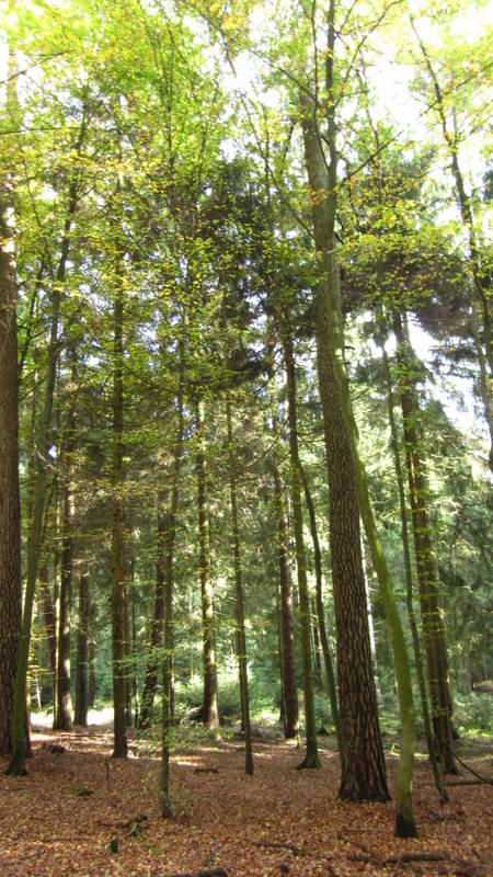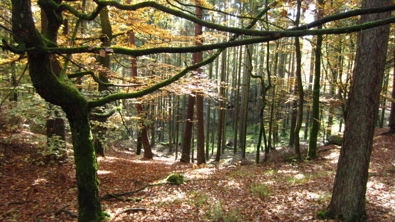 Ich betrat den wunderschönen Mischwald. Am Rande vom Wald wuchsen Buchen, z.T. vermischt mit den Kiefern. Tiefer im Wald war ein Fichtenwald (dort weiter ging dann nach unten zum Mullerthal Trail Wanderpfad). Ich blieb aber oben, wo es freundlicher war.