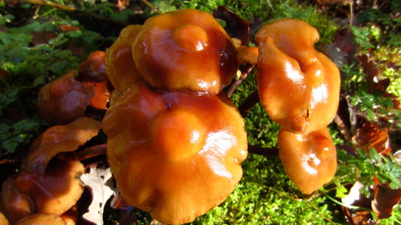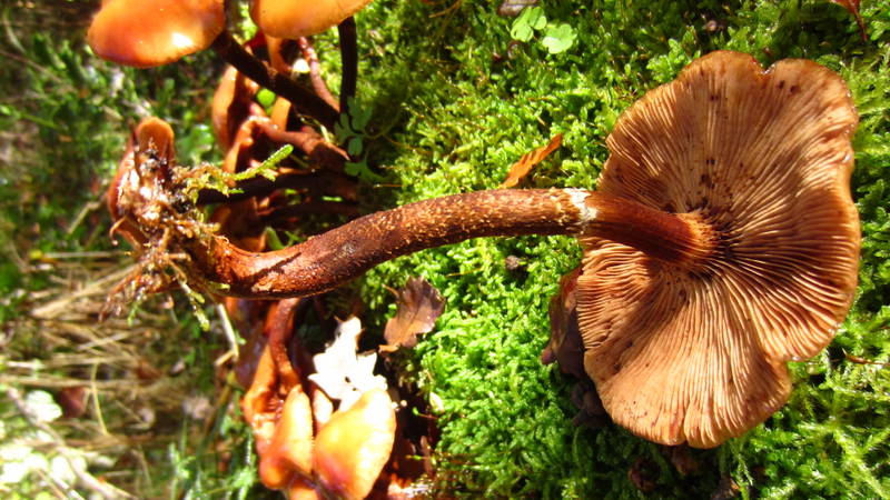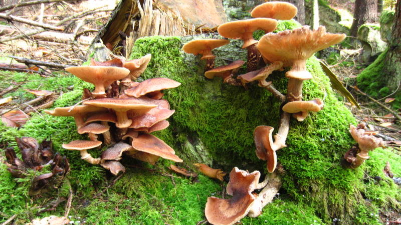 Immer wieder sah man auf den Fichtenstumpfen Dunkle Hallimasche (Armillaria solidipes, syn. Armillaria ostoyae)