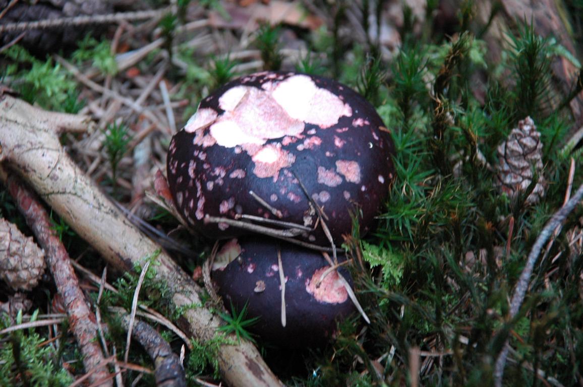 Hut: 4-10 cm Breit, meistens purpurrot bis violett gefärbt mit dunkler fast schwarzer Mitte, öfter mal mit leichtes buckel, die Hut Farbe kann aber auch varieren von olivgrün bis gelblich.Der Hut ist jung konvex, dann ausgebreitet und im Alter niedergedrückt. Die Huthaut ist anfangs klebrig und fühlt sich trocken und fettig an.