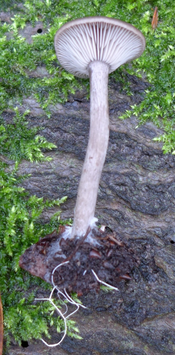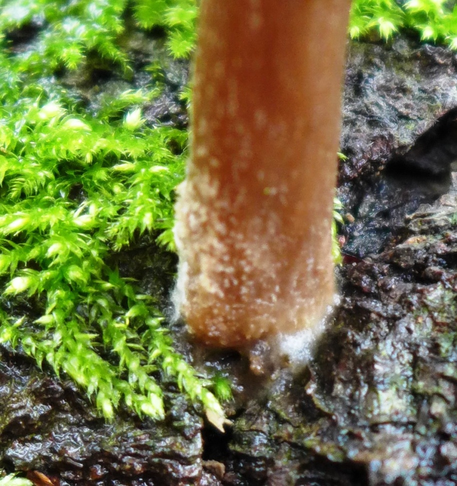 Der kleine schöne Pilz war vielleicht am Hut 2-3cm groß aber mit Stiel durchaus 8 cm hoch. Geruch nicht wahrnehmbar. Er wuchs auf einem alten, schon vermoderndem und bemosten Buchenstamm. Auffällig war das Wurzelwerk, welches nach dem Herausziehen aus dem Stamm sichtbar wurde:
