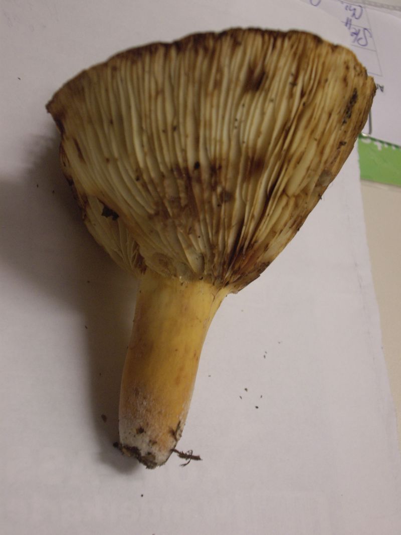 Enno hat mir als erste Lösung Gompidius glutinosus (Großer Gelbfuß/Kuhmaul) geschickt. Auf die Frage von Kuschel, ob der Pilz Poren hat, meinte er er müsse sich umentscheiden,wenn dem so wäre. Ich wollte ihn nur aufklären, dass G. glutinosus zu den Boletales gehört. Dass dann mehrere andere Teilnehmer den Pilz dann auch nannten aufgrund dessen, konnte ich nicht ahnen.
