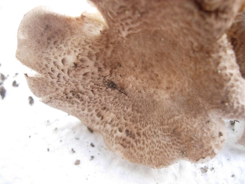 Lamellen: Ausgebuchtet am Stiel angewachsen, leicht herablaufend, dicht stehend und sehr dünn, weiss bis grauweisslich aber nie ganz grau schon jung deutlich gilbend, im Alter nahezu graugelb.