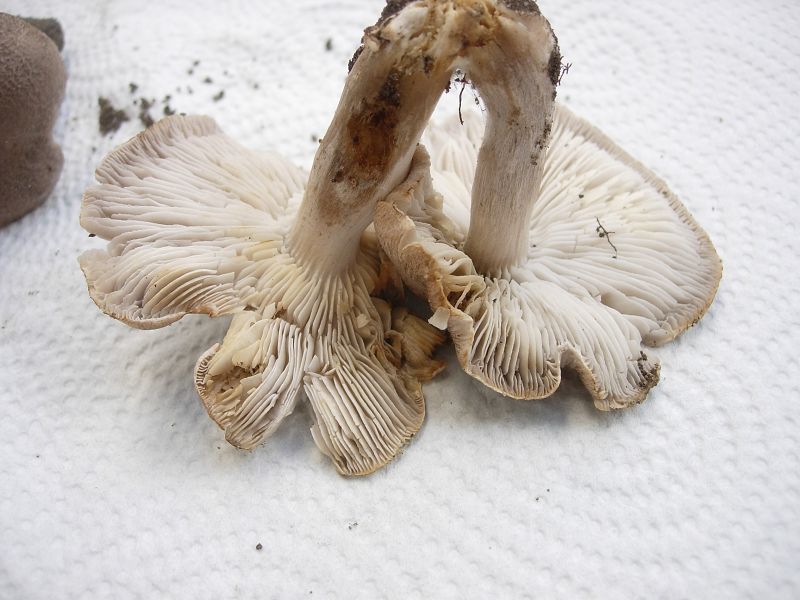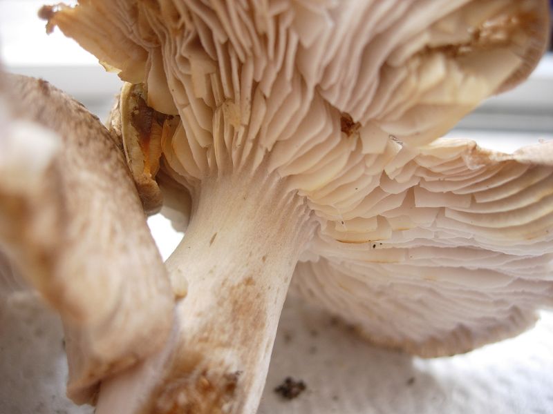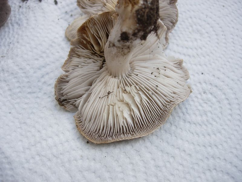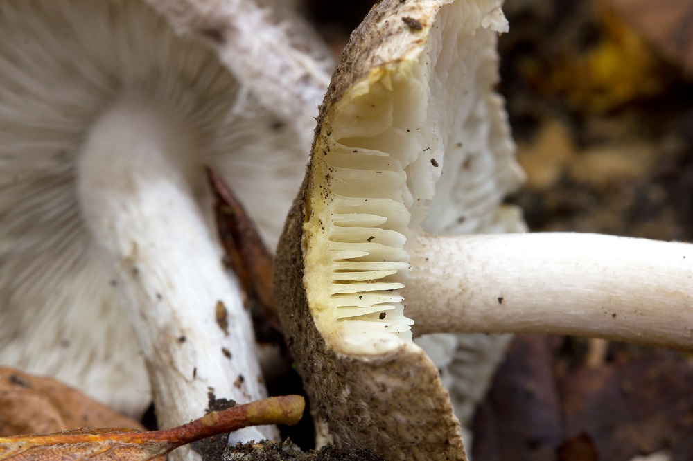 Lamellen: Ausgebuchtet am Stiel angewachsen, leicht herablaufend, dicht stehend und sehr dünn, weiss bis grauweisslich aber nie ganz grau schon jung deutlich gilbend, im Alter nahezu graugelb.