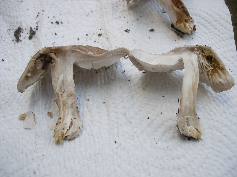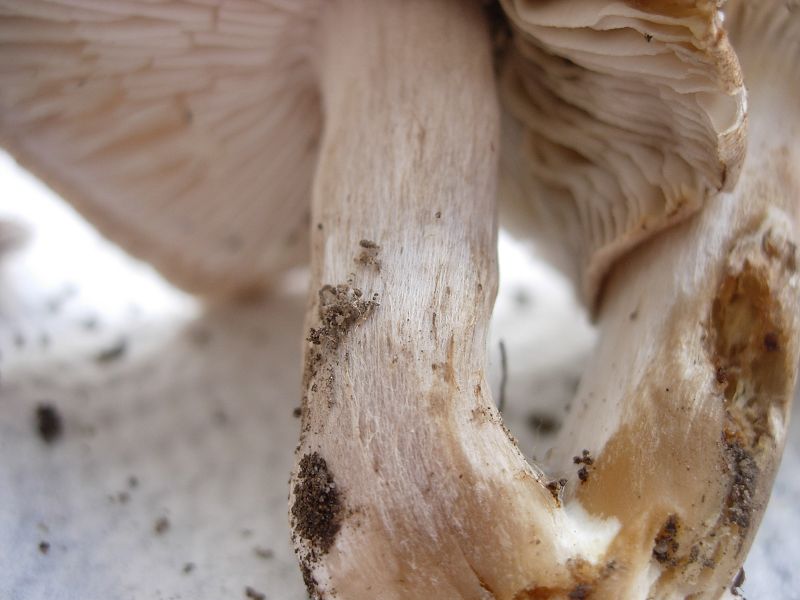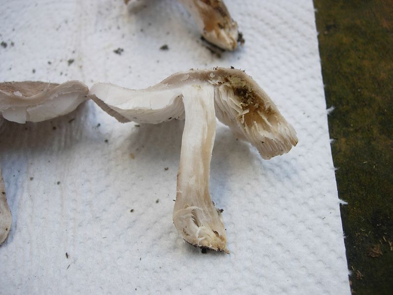 Stiel: Weiss bis grauweisslich, fein faserich mit leicht geflockter Spitze, deutlich gilbend, nach Befassen meist gelb- bis ockergraulich verfärbt.