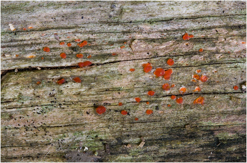 Die Pilze waren richtig winzig ca. 0,2 cm und hatten die Farbe rot-orange.