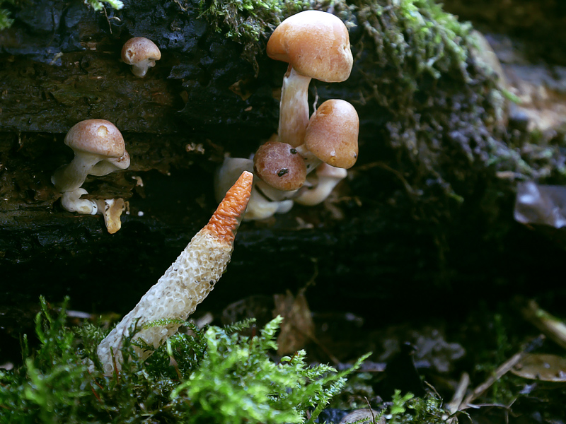 Eine Stinkmorchel mit ein paar Lacktrichterlingen.