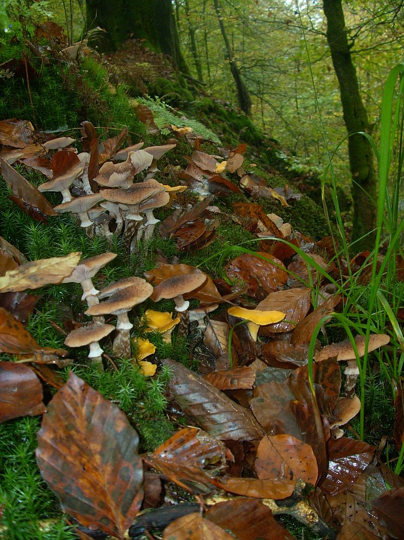 Schwefelköpfe mit Lila-Lacktrichterling als Untermieter und (Schmetterlings-?)Trameten am Dach!