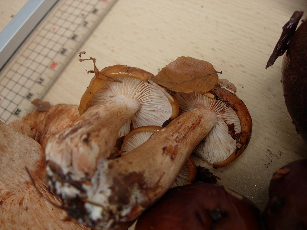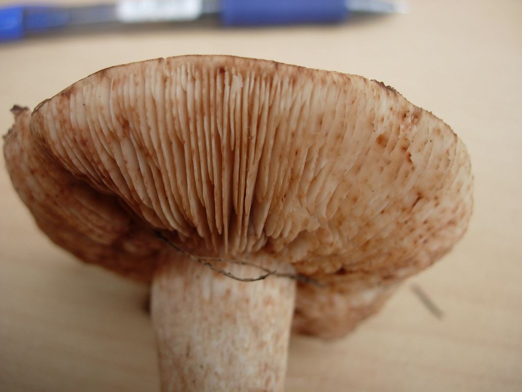 Lamellen: weißlich bis cremefarben, bald rostig gefleckt manchmal schwarz nachdunkelnd.