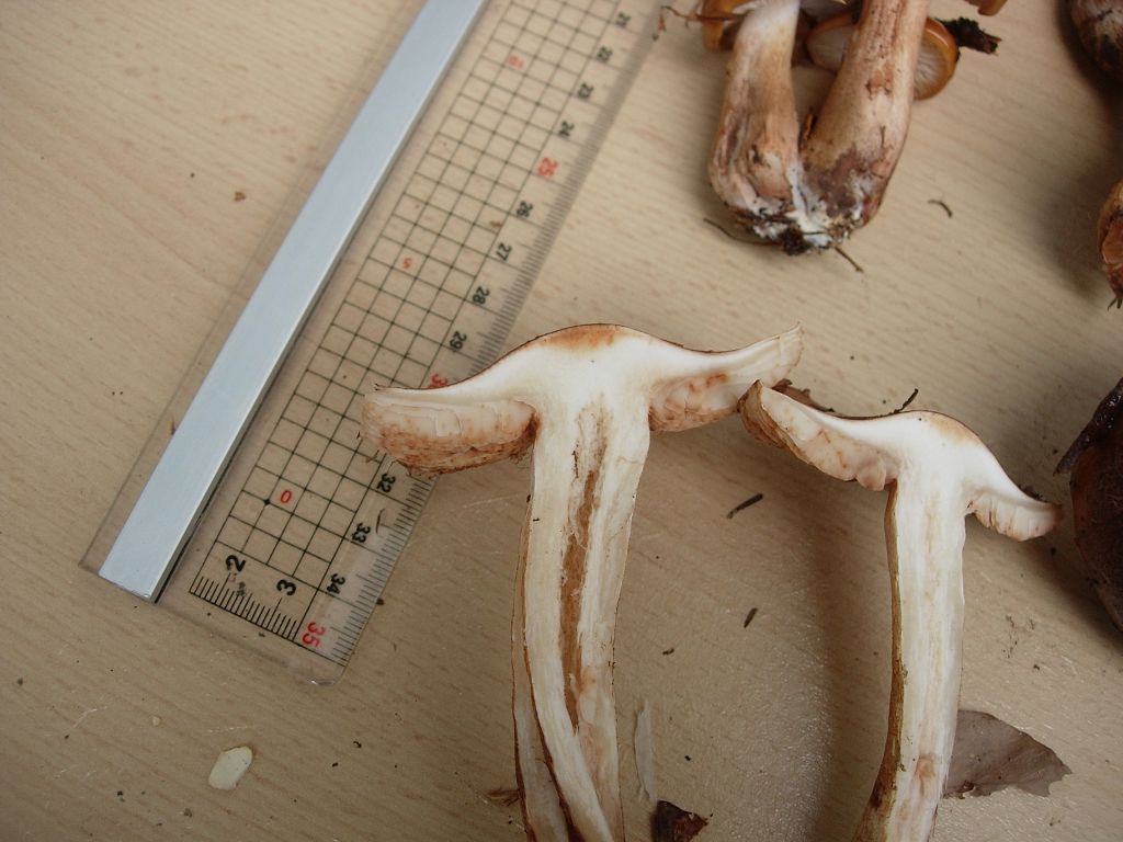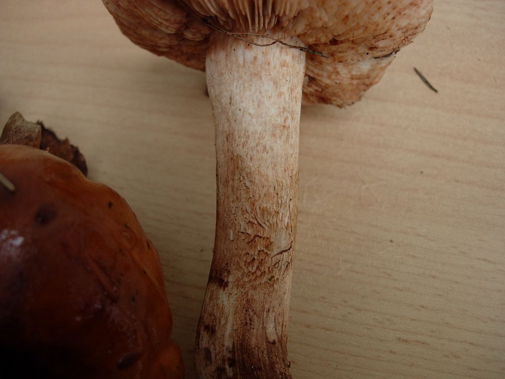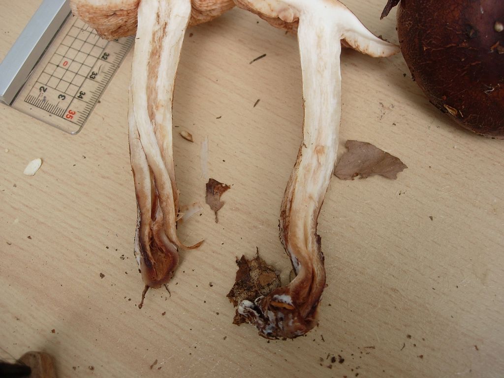Stiel: Kräftig stabil-faserig, im Alter schon mal hohl, die Spitze ist cremeweis und dunkelt gleichmäßig zur Basis hin mehr und mehr längsfaserig rot- bis dunkelbraun, manchmal ist die Stiel Basis etwas keulig.