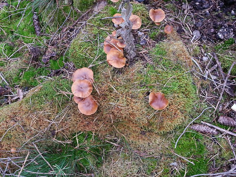 Pilz 1 könnte der Geflecktblättrige Flämmling (Gymnopilus penetrans) sein oder viell. ein Samtfuß Rübling (Flammulina velutipes)?