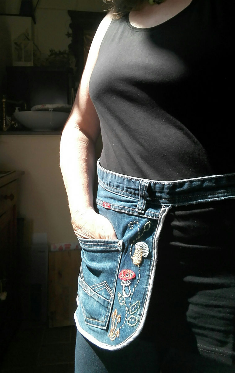 Ok, das Umnähen mit dem Schrägband und besticken ist ein "bisschen" mehr Aufwand. Aber die alte Hose zurechtschneiden ist echt simpel. Das wäre auch ein (Klischeemodus an) Männerbastelprojekt (Klischeemodus aus). Man kann diese zusätzliche "Seitentasche", auch ohne einen einzigen Nadestich machen zu müssen, nutzen.