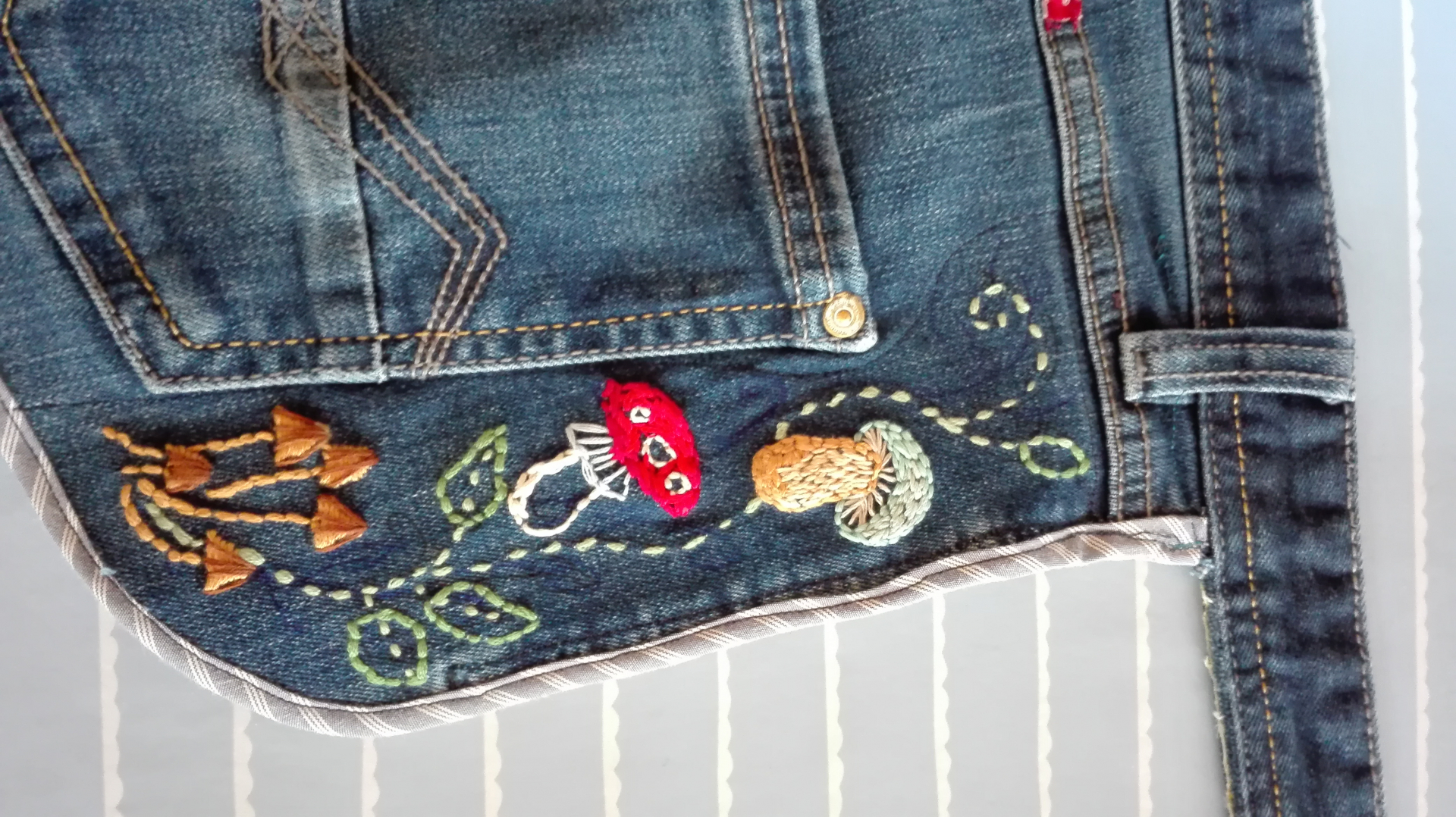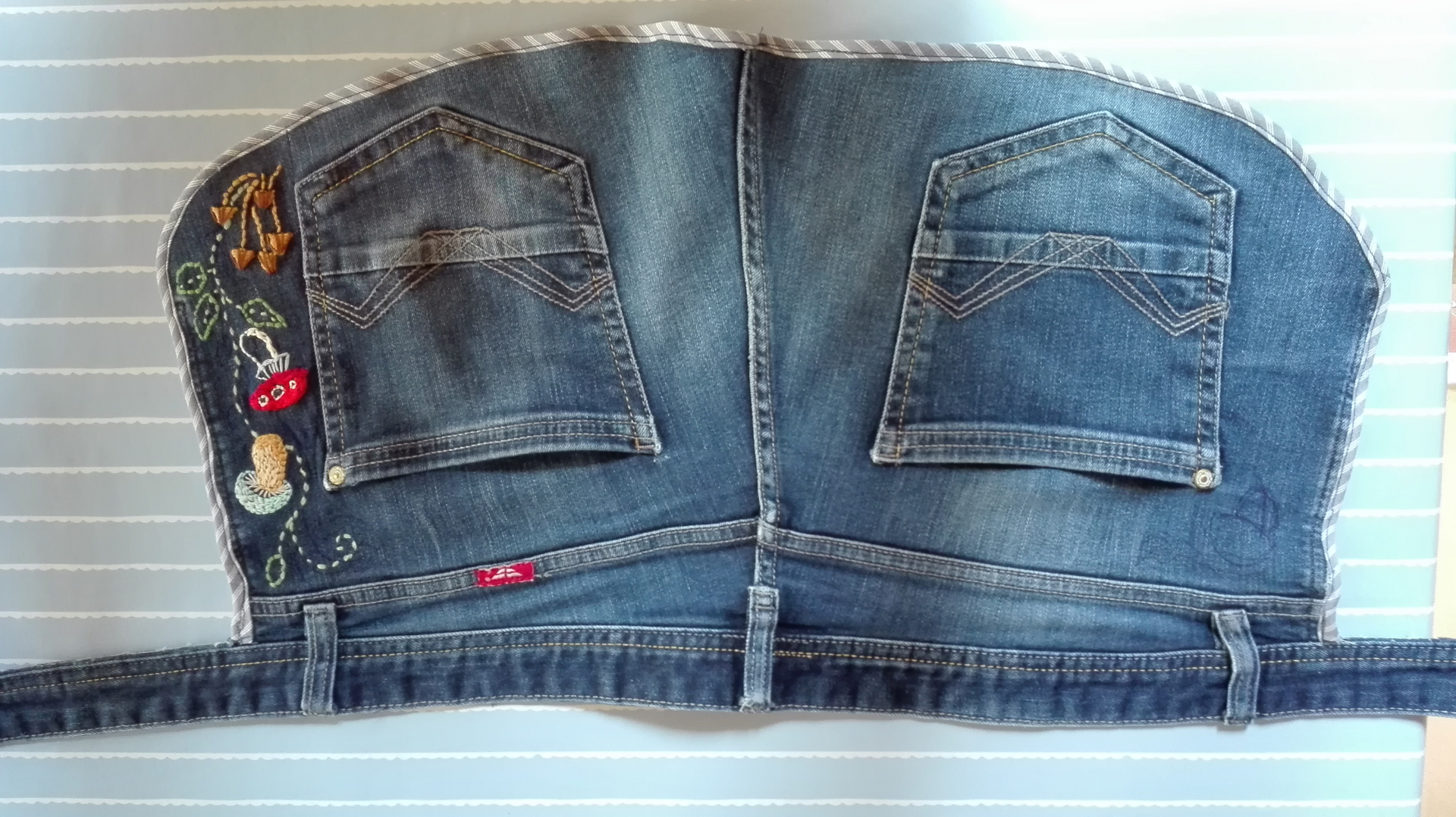 Aus einer alten Jeans einfach den Bund und das Hinterteil rausgeschnitten, ganze versäubert mit einem Schrägband und dann bestickt.Klasse, Tuppie!==Pilz22