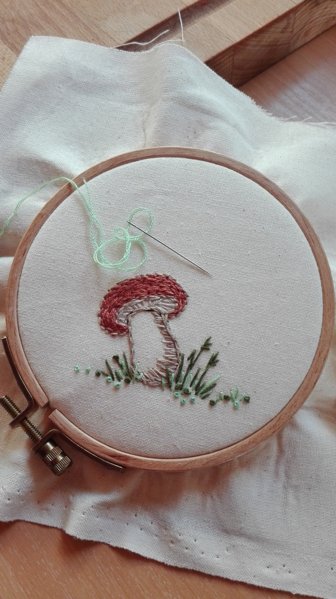 Dankeschön. Ich bin noch ein bisschen am Ausprobieren, die richtige Mischung aus ausfransenden Stoffen und klaren Linien. Jetzt bin ich gerade an einem Blumenlesezeichen. Wenns fertig ist zeig ich es, auch wenn keine Pilze drauf sind.
