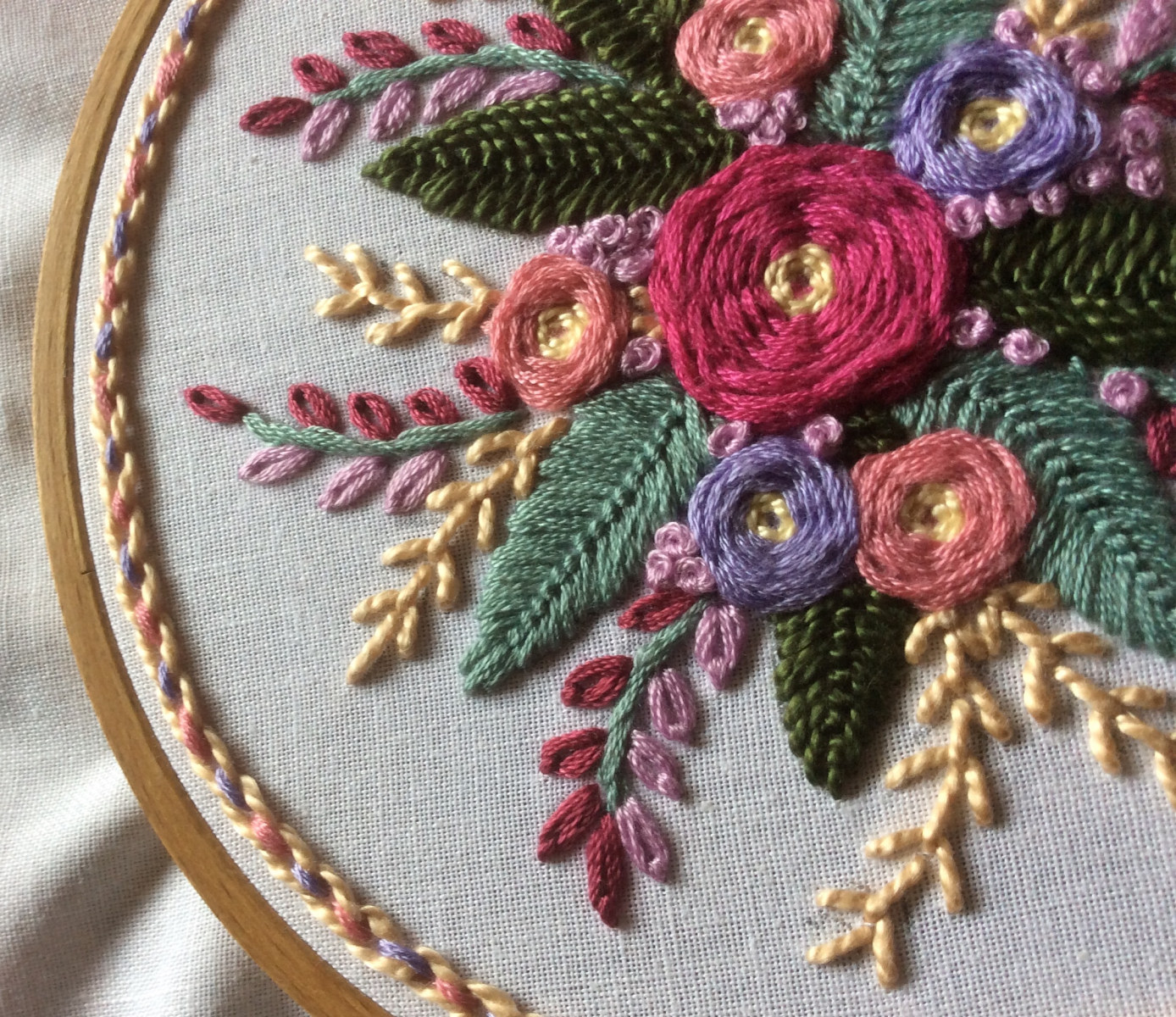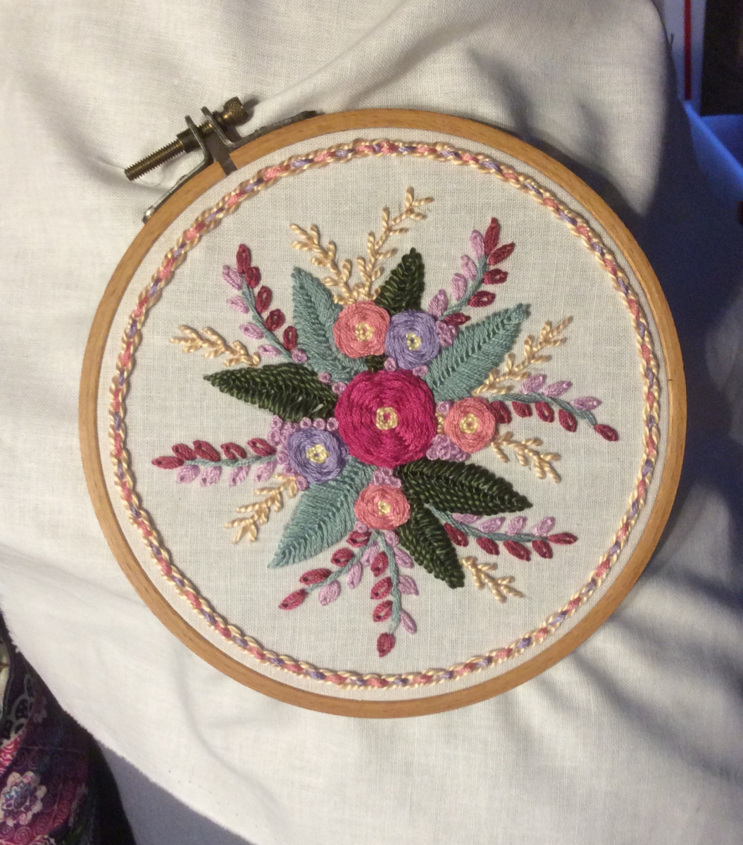 Daß ich dieses Blumendings gestickt habe, war so ne Hauruck-Aktion: Auf der "Instructables"-Seite zufällig ein Sticktutorial für diese runden gewebten Röschen/Blümchen und die wunderschönen Blätter gesehen, keine Ruhe gehabt, bis ich es ausprobiert habe und die Technik beherrschte, was für jemanden, der schon gestickt, gestrickt, genäht und gehäkelt hat, nicht so schwer war. Aber natürlich mußte das gleich ein richtig schönes Stickbild werden, frei nach dem Motiv der Tutorialseite per Hand vorgezeichnet. Werde es vllt. auf ein Kissen, eine Tasche o.ä. draufnähen.